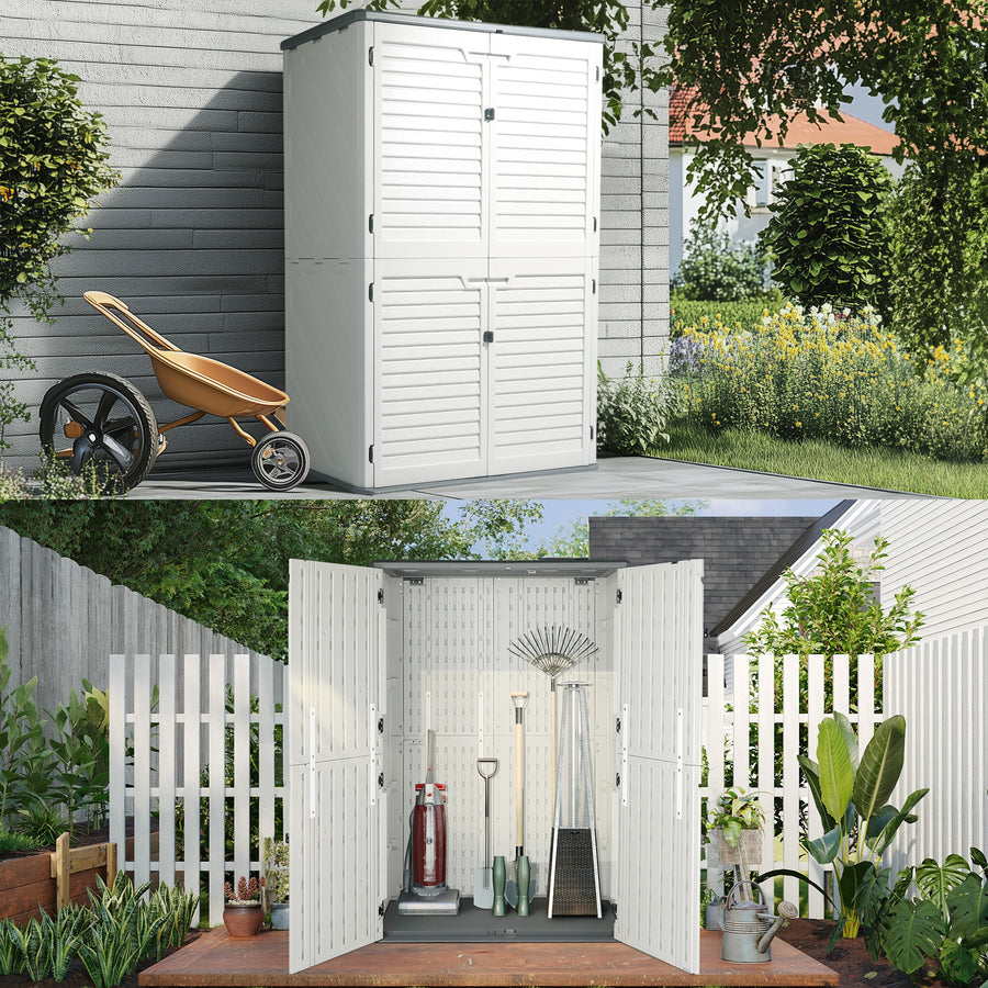 This vertical storage dynamo packs 50 cu.ft of space into a sleek frame, perfect for long-handled tools, garden supplies, and pool essentials. Its clever four-door design (easily converted to two doors) means easy access to everything, no digging required.