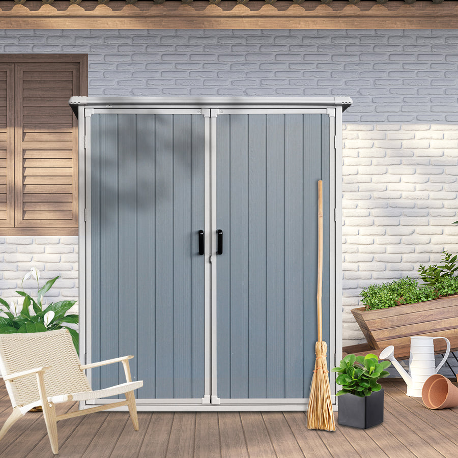 This easy to assemble and low maintenance 5ft Resin Tool Shed Storage Cabinet is a great storage alternative to traditional outdoor metal or wooden cabinet. Our upgraded large outdoor storage shed is made of thickened plastic panels and comes with a snap-in floor for quick use. The sloped designed roof has achieved rainwater runoff. The innovative storage shed is easy to assemble, and the snap-in assembly is fast and stable. It is also easy to move due to its lightweight design. Whether you want to store tools, gardening equipment, beach supplies, or anything else, this storage shed can meet your needs.
