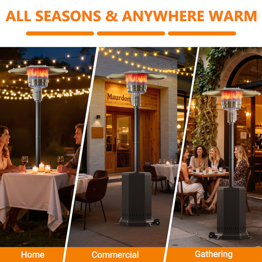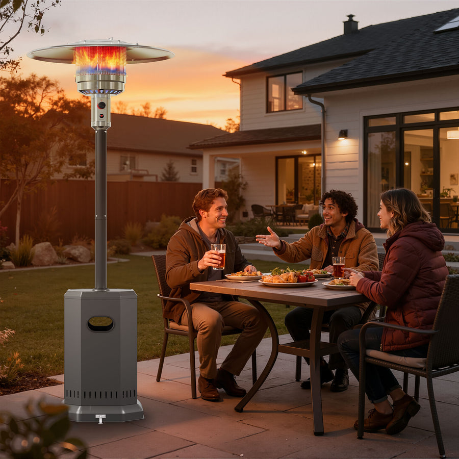 Turn crisp evenings into cozy memories. As the sunset spills across the sky or conversation drifts late into the night, the Seizeen patio heater surrounds your patio, deck, or café corner with gentle, radiant heat. A powerful 50,000 BTU stainless-steel burner creates a 20 ft (≈78 sq ft) comfort zone within minutes—perfect for family dinners, lively parties, or quiet moments under the stars.