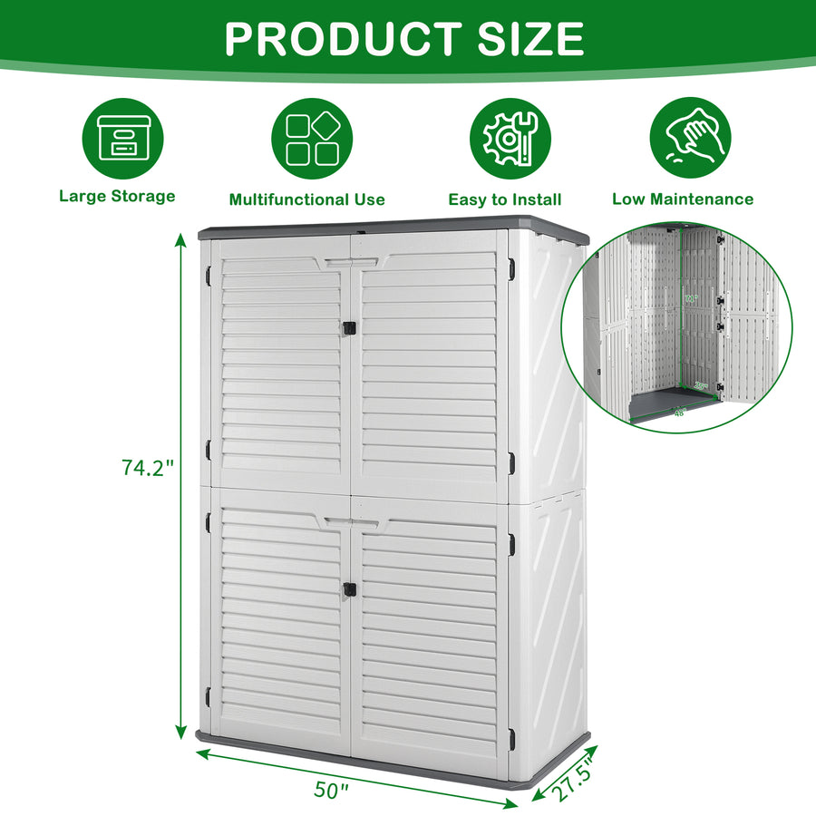 - 1. Vertical Design with Four Doors: This vertical storage shed is perfect for storing long-handled tools, garden accessories, and patio essentials. Its four-door design features connection bars, allowing you to effortlessly convert it into a two-door setup.