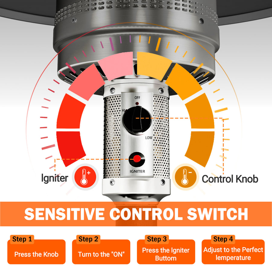 - ☀️Safety Design - The outdoor heater is equipped with an automatic safety shutoff feature. When the side tilt angle reaches 45°, the burner automatically extinguishes, ensuring accident-free use.