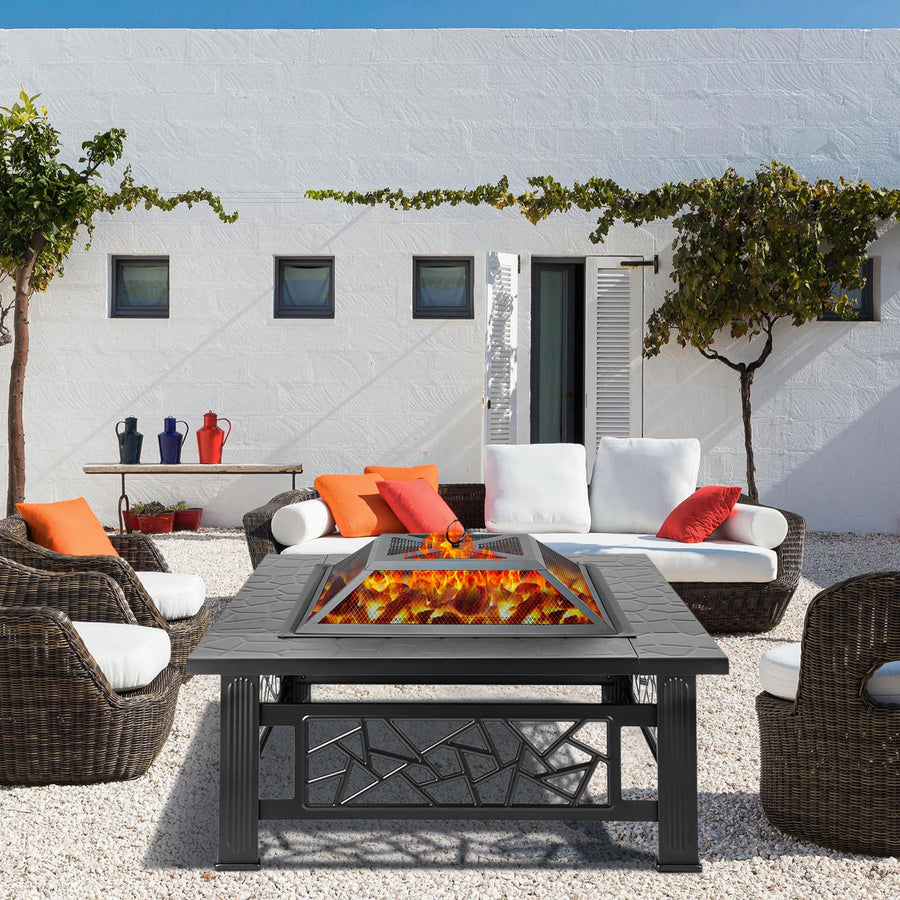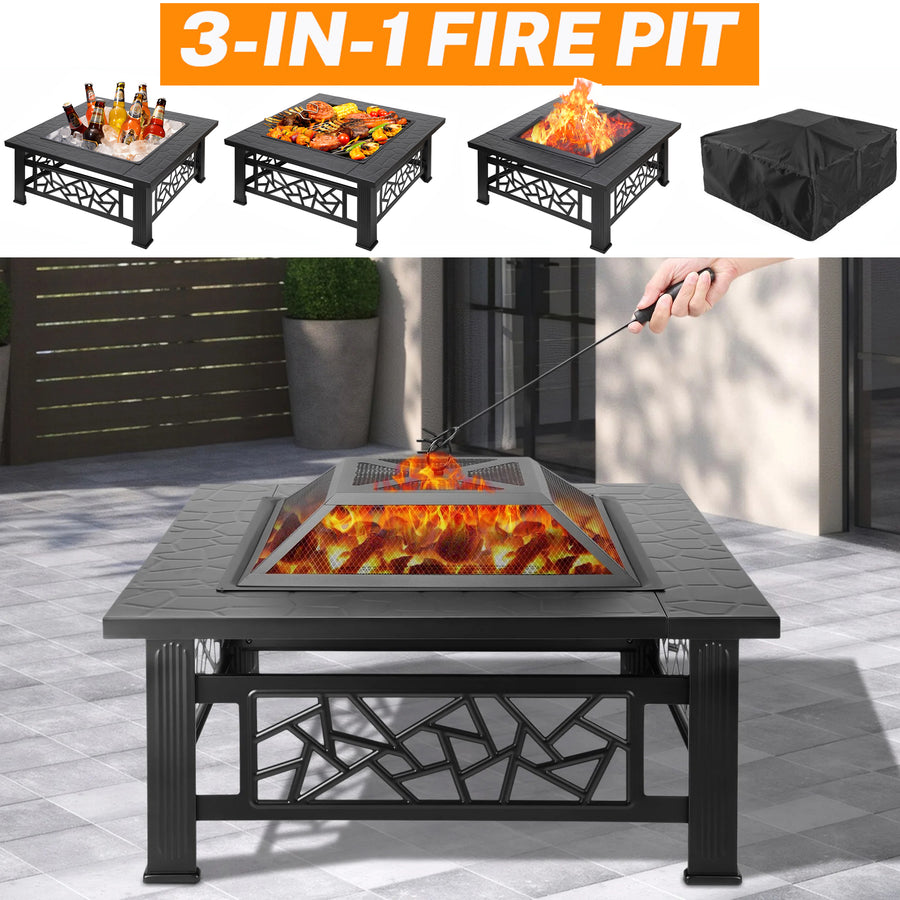 Are you planning an outdoor party with family or friends? Warm fire pit set is required. This outdoor square fire pit with stone pattern is constructed with a heavy-duty iron mesh and frame, with 4 metal feet for added stability. This is a fully equipped fire pit table with mesh screen lid for various function and wide application. Humanized design provides you with a comprehensive solution for outdoor entertainment. It would be perfect ideal for heating, grilling( Not include grill net) and freezing drink & food in patio, garden and yard.